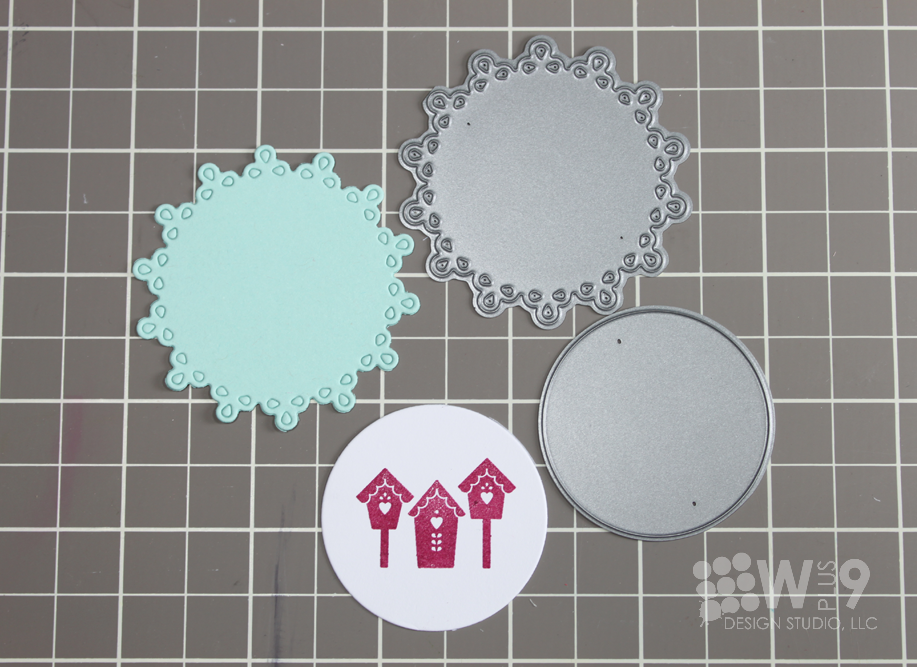 To create the focal point, I used two of the circles from Circle Stackers 1. I stamped the row of bird houses onto the simple circle and stacked that onto the pointelle edged one. I used this die on one of my cards yesterday and opted to punch out the negative spaces for that card. Here, I chose to leave them in place.