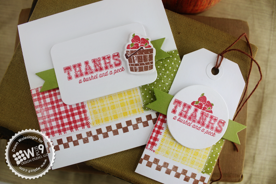 I adhered the focal image onto a rectangle that I stamped the checkered pattern from Country Charm onto at the top and bottom. The sentiment was added from Pretty Patches: Apple which I will show you more of tomorrow.